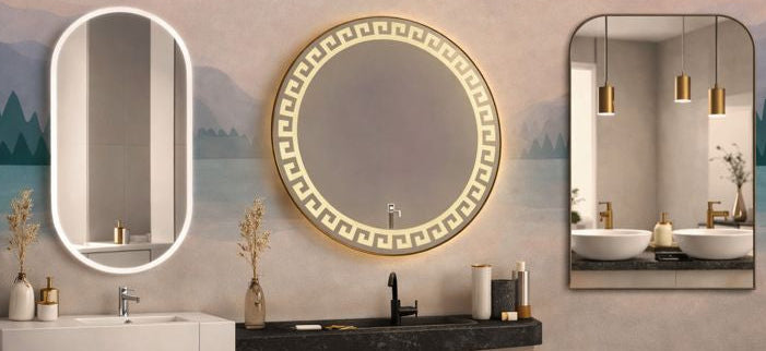 Designer LED Round Bathroom Mirror with Greek Key Motif – Touch Sensor Anti-Fog Wall Mirror